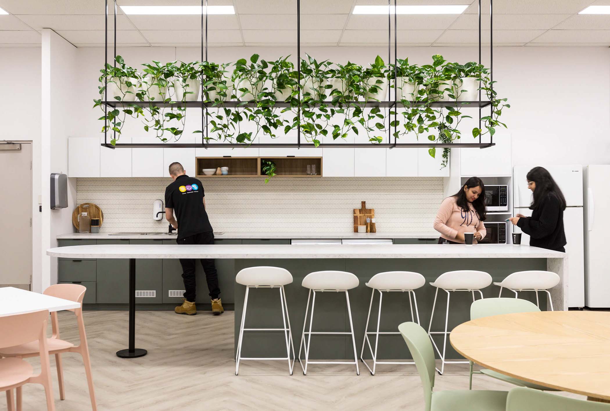 Everyone enjoys a bit of green in their day, as it brings us back to nature. Green has a calming effect, and as interior design often draws from psychology, many offices are choosing to add a bit of greenery to their spaces. This can come in the form of painted green feature walls, indoor plants, or a green wall of lush office-friendly plants, as implemented in a recent project with Rentokil Initial.